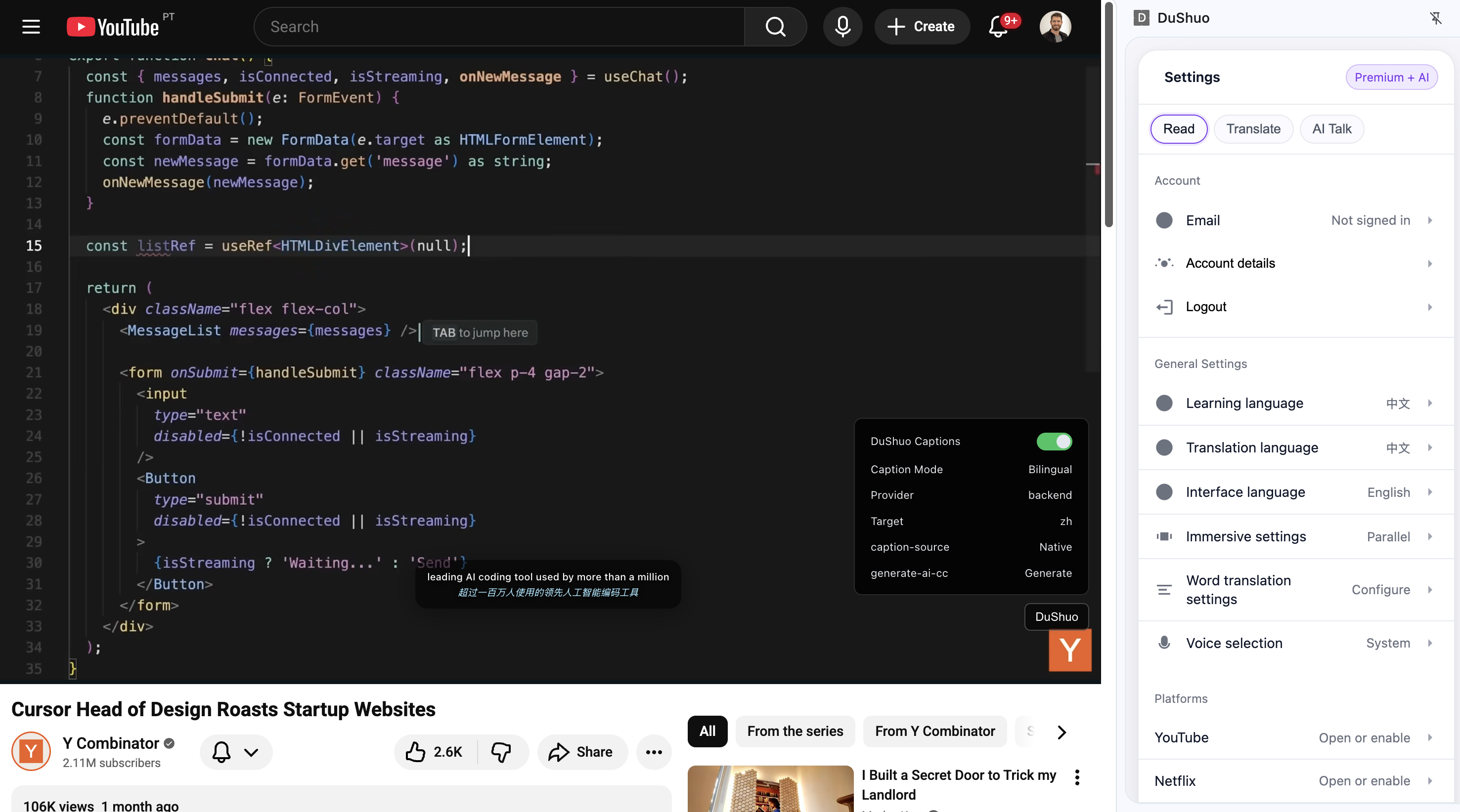 In my search for a tool to help me learn Chinese, I found that most of the tools available were either too simple, or too expensive for the limited utility. So I came up with the idea for Dushuo - 读说. It started as a Chrome extension that turns any chinese character on a webpage into an engaging learning tool. It allowed users to hover a word for meaning, display pinyin, and save vocabulary in one click. In follow up itterations it allowed users to attach the same layer to streaming subtitles. Through a mix of subtitle extraction, and ASR powered STT. This required a bit of magic to get right, but it was a fun challenge to buffer the audio stream, and align it with the subtitle stream. Thanks to open source models like SenseVoice Small, I was able to run this on my own hardware, and build in model optimizations to make it run fast and reliable.